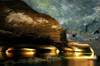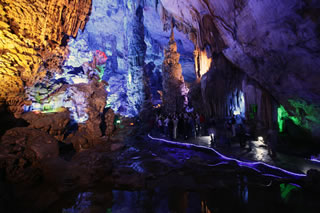 地底湖を湛えたこの洞窟は「自然の巨大芸術宮殿」とも呼ばれ、美しくライトアップされた内部には「雪の中の松」、「キノコの丘」、「龍の塔」、「天を削る双子」などの名前が付けられた岩が。