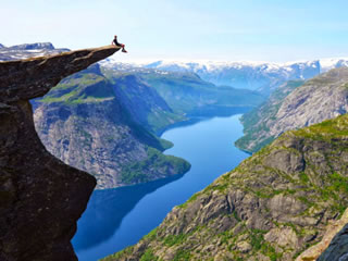 ノルウェー西武の氷河地形の中にある、今にも折れそうな一枚岩の先端はデンジャラス上等という観光客の聖地ともなっている。