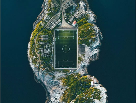 これは「トロルの舌」と同じノルウェーの漁村ヘニングスヴァールに造られたサッカー場を上空から撮った写真。こういうアングルで見せられると不思議な気持ちになりませんか。