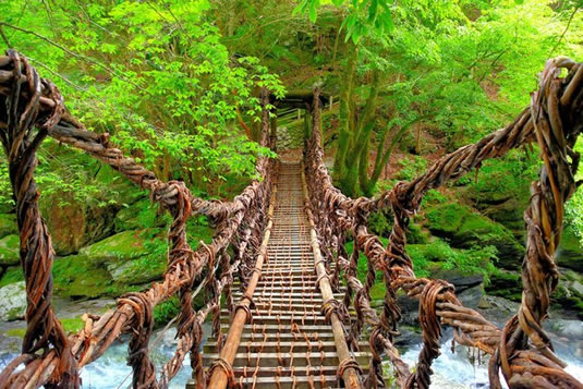 これは「日本三奇橋」に数えられる徳島県三好市の吊り橋『祖谷のかずら橋』。(下はかなりの峡谷)