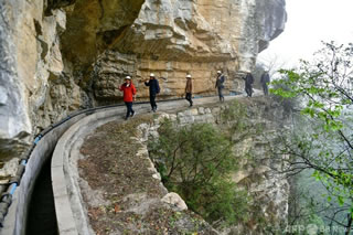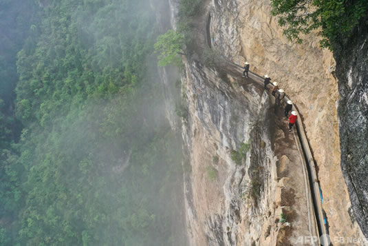 ・・これは中国貴州省の天空用水路「高流天渠」を維持補修するために見廻っている作業員たち。