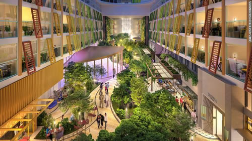 実際、この船内は8つの「街」から構成されており、洋上最大のウォーターパークエリアや美しい滝が宙を流れるアクアドーム、本物の樹木が植えられたオープンエア公園まである。