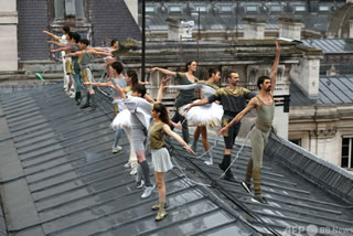 屋根の上で踊るダンサーたち。とても危なく感じましたが、写真をよく見ると、二人ずつペアで命綱を結んでいたのですね。