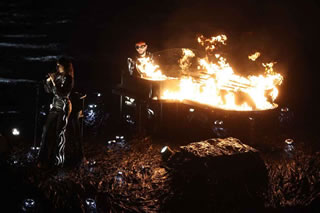 燃えるピアノの伴奏で『イマジン』を歌うジュリエット・アルマネ