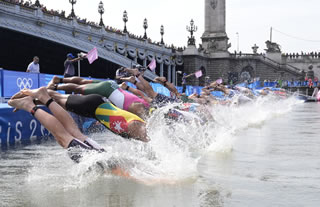 茶色く濁ったセーヌ川に飛び込むトライアスロンの選手たち