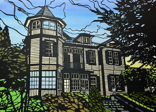 これは野毛都橋商店街をレトロなイメージで再現した作品。このように、切り絵の背景に色を入れる技法が生まれているのですね。