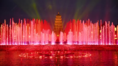こちらも”音楽噴水”で、隣接する不夜城「大雁塔」と合せて極彩色にライトアップされています。(さすが中国風・・)