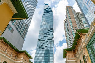 例えば、バンコクの「キングパワーマハナコン」。ところどころ崩壊したようなデザインが目を引く高層建築物です。