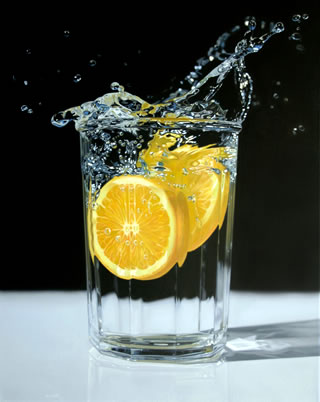 コップに放り込んだレモン。この水しぶきのリアルさ、凄いです。