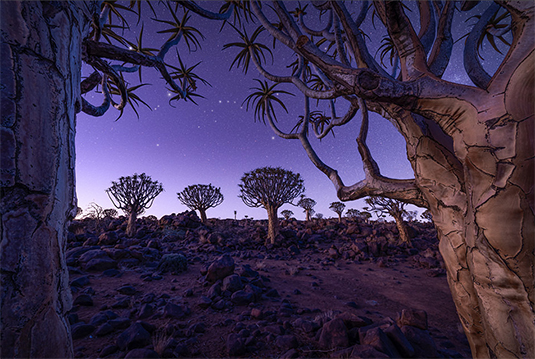 場所はナミビアのクイバートゥリーという樹木の森で、先住民のサン族はこの木の枝で狩猟用の毒矢を収める矢筒を作るため「矢筒の木」(quiver tree)と呼ばれるとか。
