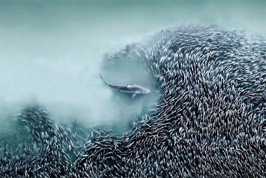 これは、ニューヨーク州サウサンプトン沖でメンハーデン(ニシン科)の群れを捕食するハナザメの写真。