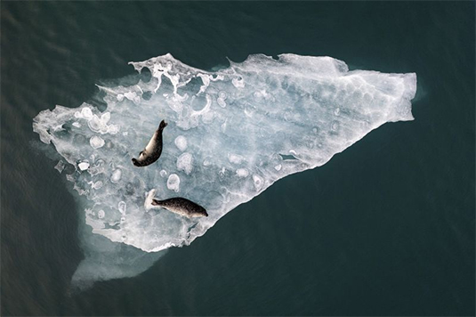 アイスランド南部のヨークルスアゥルロゥン氷河湖の氷の上でくつろぐアザラシの写真。