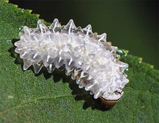 コスタリカなど中南米の熱帯雨林地域に生息する「イラガ」の幼虫で、全身がイボイボのついた透明体です。