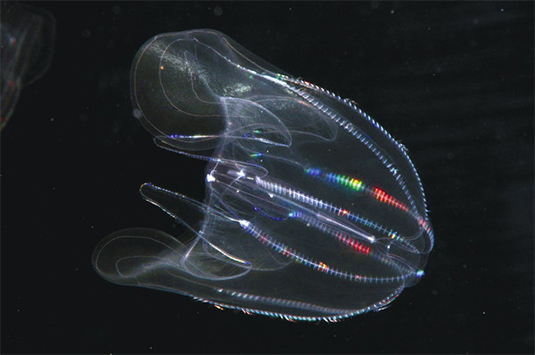 触手はなく、繊毛が束になったクシ状の板を動かして泳ぎ、光を反射すると、ご覧のように虹色に光って見えます。まるでネオンサインのよう。