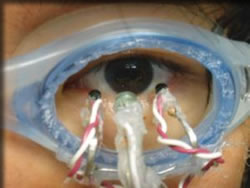 方法としては、左右を反対色に塗り分けられたプレートを被験者に見つめてもらい、その視線をアイトラッカーという装置を用いて網膜上の一点に静止させるというもの。