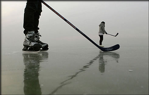 凍った池の上で、アイスホッケー…ってか、遠近法!?