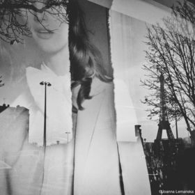 ポスターのあるショーウィンドウに写りこんだ街路樹やアイアン・レディ(エッフェル塔)が、不思議な効果を感じさせてくれます。