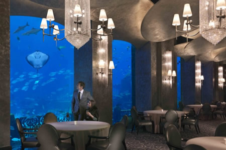 実は、このアトランティス・ホテルの最上階には一泊254万円のスイートルーム群がありまして、写真のディナー・レストランを含めた区画全体が巨大水槽で囲まれているのです。