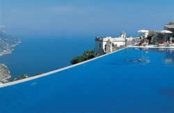 ここは、11世紀の貴族の宮殿を改装したホテルで、ごらんのようなインフィニティ・プールで泳げば、遥か彼方の眼下に地中海が広がるという絶景の地なのです。
