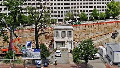 この場所は市街地再開発を行ってショッピングモールを建設する予定地だそうですが、一軒だけ立ち退きを拒む家の周りを9メートルほど掘り下げて“陸の孤島”と化しています。