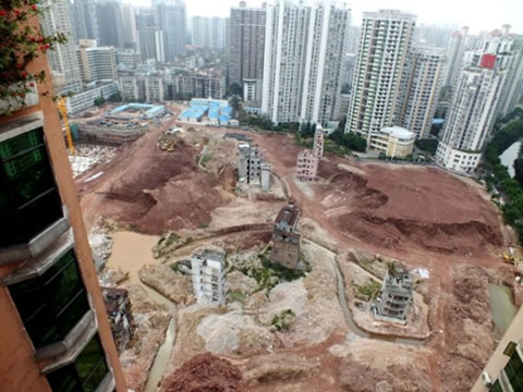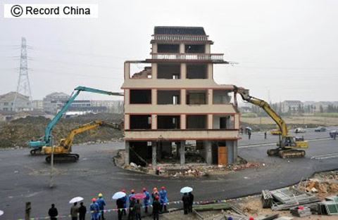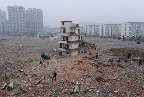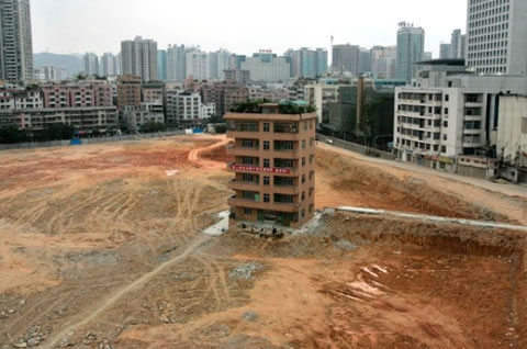 土地の私的所有が禁止され、利用権さえ大幅に制限されている中国では、公共事業に伴う立ち退きを拒否した場合は、“見せしめ”のようにソコだけ残して工事が強行されるのでございます。