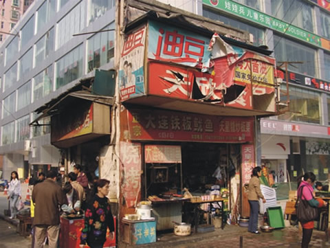 これまでは整備中の事業でしたが、この上海の二階建ての小屋は既に供用開始された道路区画の歩道の上に居残っています。