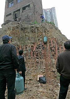これは、湖北省宜昌市の建築現場に残された2世帯の家。電気と水道は夜になると断続的に通らなくなるそうであります。