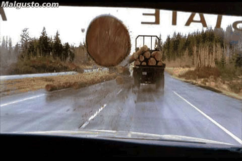 前のトラックの荷台から積み荷の丸太が崩壊した写真。