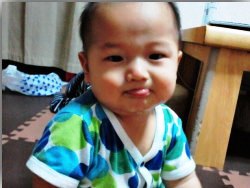 ( ̄^ ̄)としている長男様。