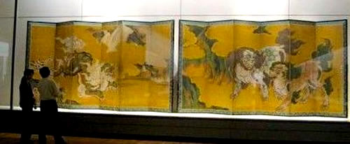 駅を出ようとすると、いきなり雨!! マジかΣ( ̄□ ̄;) 構内ウロウロして雨が止むのを待つけど、 10分ほどで上がったので、いざ。 初めて知ったのですが、よく教科書なんかに載ってる唐獅子図屏風はこれだけど↓ 屏風は六曲一双なので(つまりニコイチ)もう片方があるわけですよ。 で、全体図がこれ↓