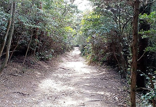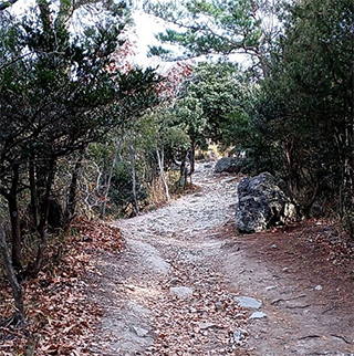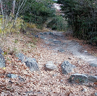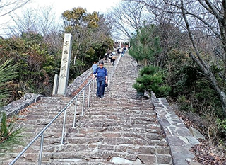 引き返すんやったら早めがええよな、金毘羅山よりきついよな、とばば様と2人話しつつ、休みつつ、行けども行けどもカーブを曲がる度にえっこんなん行くんかΣ(~□~;)となりつつ。 舗装もされておらず、傾斜はあり、落ち葉と砂利、砂で滑りそうで焦る。 でも、じーちゃんばーちゃんも登っとるんよね~。 一時間ほど軽く登山。汗だくです(^^;) 最後、階段なのがありがたいような、悲惨なような。