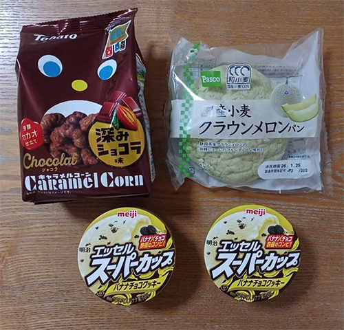 次男様へのお土産は、スーパーカップ、チョコバナナ味2個、カフェオレ(雪印じゃないとダメらしい)、メロンパン(緑のがいいらしい)。