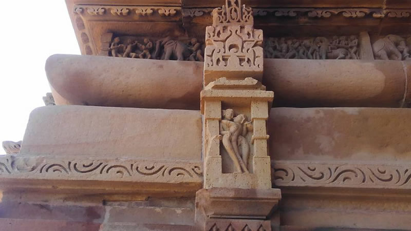 壁を埋め尽くす男女交合像(ミトゥナ)のレリーフ 尖塔(シカラ)は男性のシンボルを表すとか…