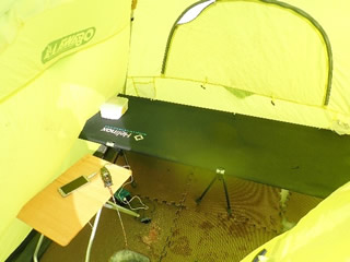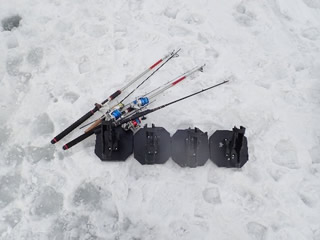 I made ice fishing rod holders for kokanee and trout fishing. I'll set short ice fishing rod to them, and set small bell to rod tip.And then I'll wait that's sound on the bed in shelter..