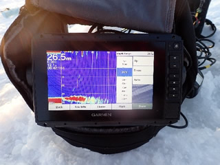 岩洞湖に氷上ヒメマス釣りに行きましたが、群れが見つからず、ボウズでした。