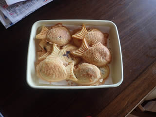 I can't go fishing until March, so I made Japanese fish sweets "Taiyaki" on the stove. It's fish-shaped pancake filled with bean jam and also delicious.