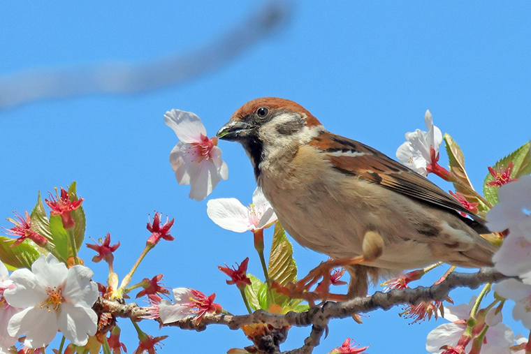 今年は自宅前のソメイヨシノが4月上旬に満開になり、スズメが桜の花の蜜を堪能していました。
