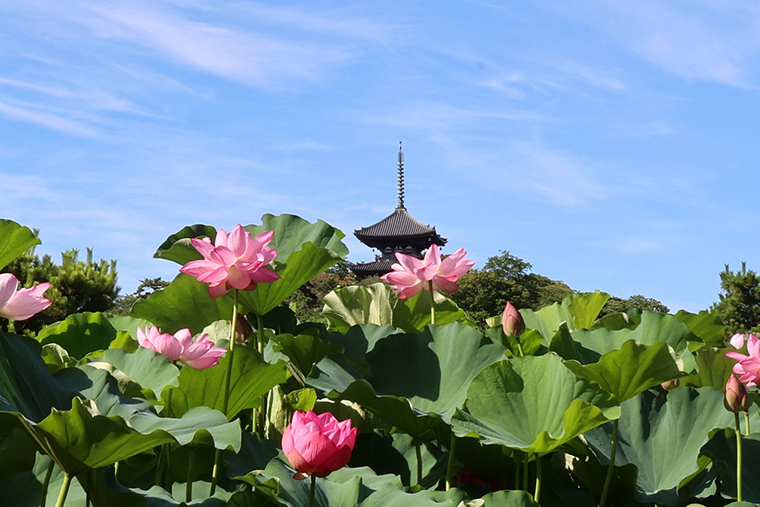 蓮の花に焦点を合わせつつ、奥の三重塔がピンボケしないように撮れました。