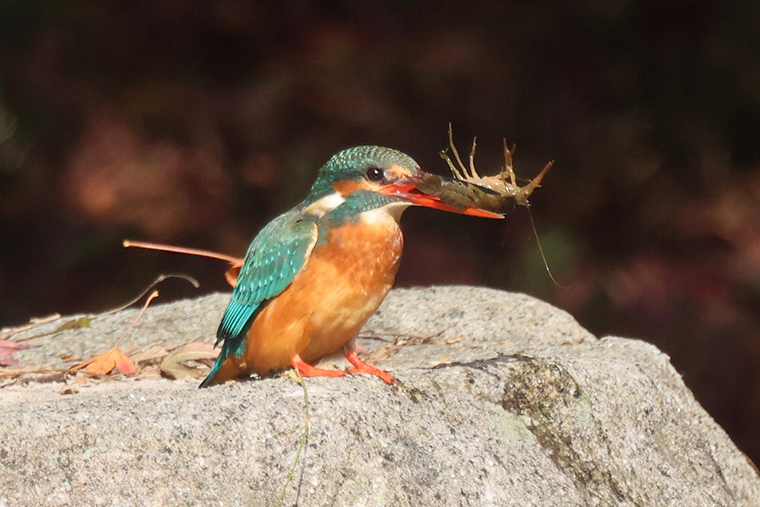 紅葉の枝から池に飛び込み、食べごろのザリガニをゲットしました。