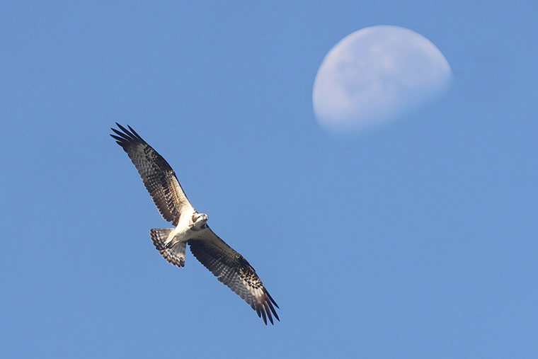上空を飛んでいるミサゴを見つけ、カメラを向けて追いかけていると、月の近くにきました。