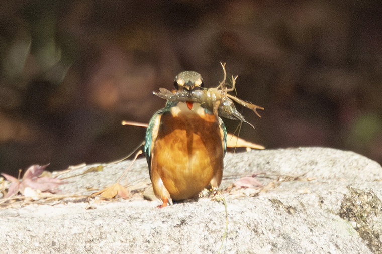 ザリガニを何度も石に叩きつけ、柔らかくしてから、なんとか飲み込みました。