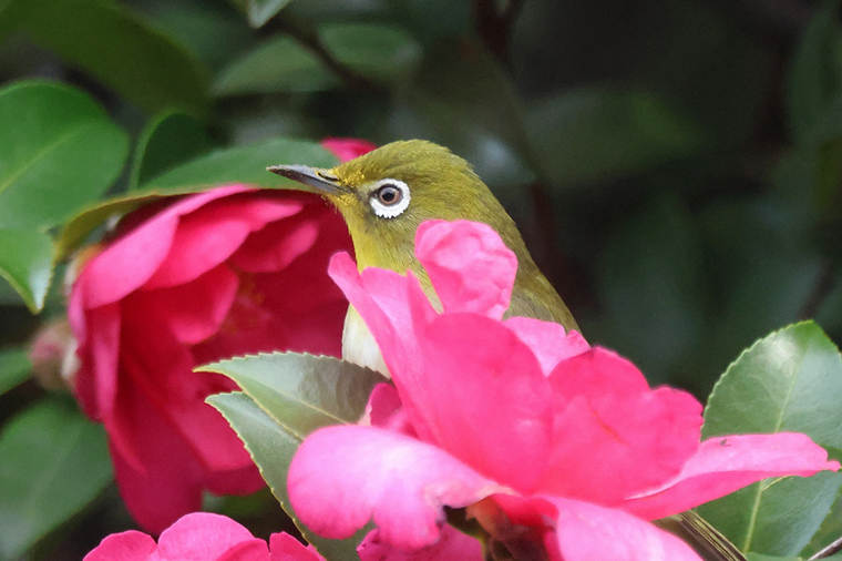 白梅と紅梅の近くで山茶花も咲いていて、この花にも蜜を吸いにやってきます。