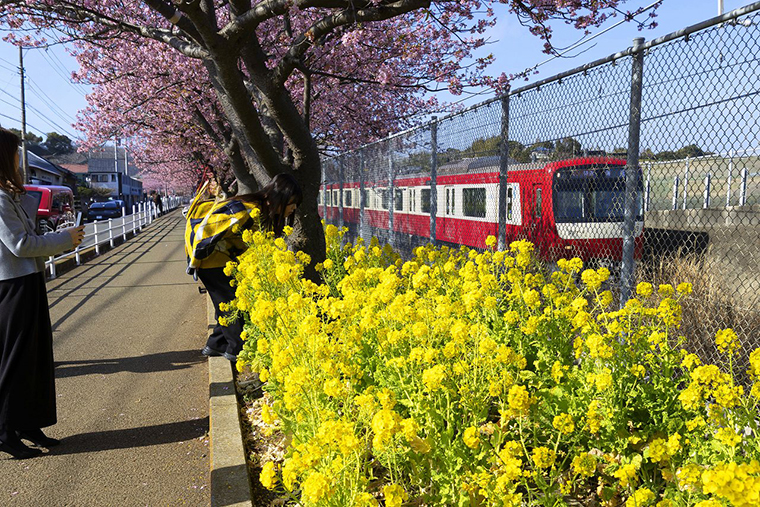 河津桜と菜の花を撮っていると、ちょうど京急電車がやってきました。