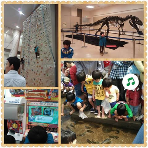 写真は、GWと春休みの思い出。 チャレンジウォール、四分の三くらい登れました!!(*^^*) 恐竜の化石~ ニジマスつかみ取り~ 妖怪ウォッチ~