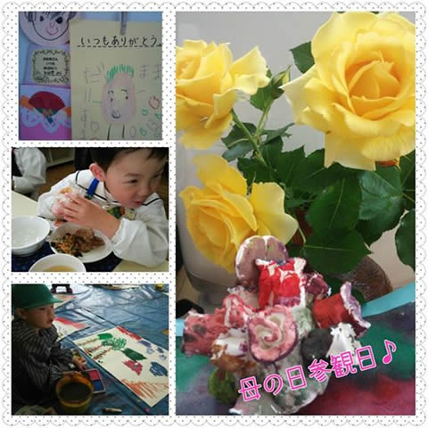 母の日参観日☆ 今年度は、アートに力をいれている幼稚園。 描いたあとは、味噌オニギリづくり(*^^*)! 長男坊からのプレゼントは、バラのオブジェ