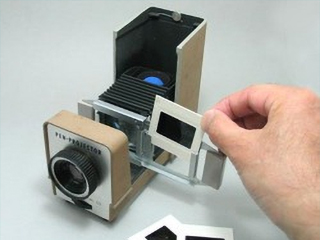スライド映写機にスライドをセットしているところ