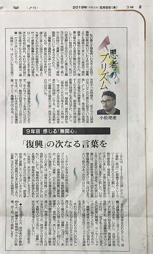 小松理虔さんの執筆、今後も期待したい(朝日新聞夕刊)。