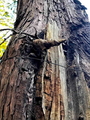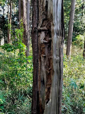 【2021/2/26】 木の中の枝 先週は、退院後の3回目の外来診察で病院へ。 病院にいるあいだは感染への緊張感があるので、リフレッシュしたくなり、文京区の小石川植物園に立ち寄った。 ここは、東京大学大学院理学系研究科の附属植物園で、そのようすから推察すると、公園のように樹木を整えずに、ありのままを見守っているように見受けられる。 生態に興味がある私は、風景を眺めるだけでなく、個々の木の特徴を見て歩く。 あるヒノキのそばを通ると、それは幹の半分が朽ちて、えぐれた内部が見えていた。 幹の中にスクリュウのような形が何本も突き出している奇妙な形を見つけて、うわうわうわ・・!と声を上げてしまった。 これはきっと、枝の元だ。
