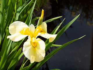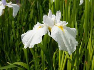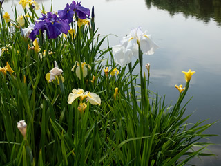山道を登って岩井の滝を見た後・ 次に行ったところは 今は既に 緑一色になっているでしょうけれど 色とりどり 水面に映る空とコラボして清々しい 黄色の花菖蒲 白い花菖蒲 ムラサキ や 大輪の 白い花菖蒲 おヤァ??