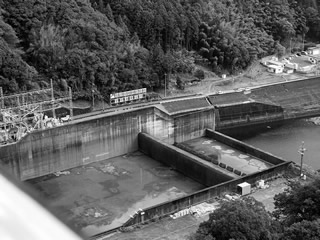 早明浦ダムは今 この大きな壁に大きな直径4mの穴を 上部の排水口だけでは間に合わなくて・その下に このバスが止まる様になっているここも水の底に ここまで来てダムの上に行かないのは残念すぎる!